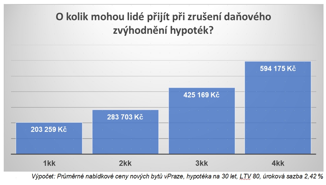 Pokud by bylo vedle zrušení daně z nabytí nemovitosti schváleno i zrušení daňového zvýhodnění u nových hypotečních úvěrů, v praktickém dopadu pro kupující nových bytů by to bylo jednoznačně negativní. V podstatě by se jednalo o novou překážku, která zastavení současné paralýzy nové výstavby rozhodně nepomůže a krizi dostupnosti bydlení jen prohloubí. U průměrného nového bytu v Praze v hodnotě 7,2 milionů korun by na daňových úlevách přišli lidé o více než 300 tisíc korun!