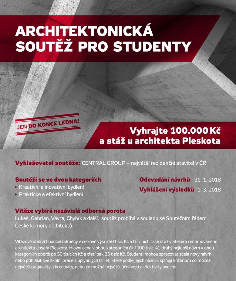 Velký zájem studentů architektury. Téměř 50 návrhů bude soutěžit o 350 tisíc korun a stáž u architekta Josefa Pleskota